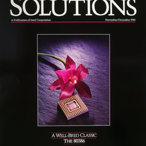 Cover of November/December 1985 issue of Intel's magazine "Solutions" showing the 80386 microprocessor.