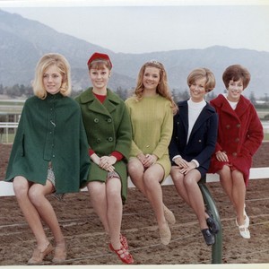 1969 Arcadia Rose Court (not in order): Queen Cindy Clark, Princesses Jacquie Wicken, Debbie Lewis, Cindy Harms, and Janis Thompson sit on rail at Santa Anita Park Racetrack. Queen Cindy Clark wears green sweater. Princesses wear wool coats.