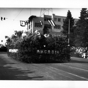Arcadia's 1926 float entry in the Pasadena Tournament of Roses Parade, "The Queen of the Foothills," and her court rode under a canopy of pink carnations. The background, signifying the foothill district, was typified by mountain oak and white and lavender heather.