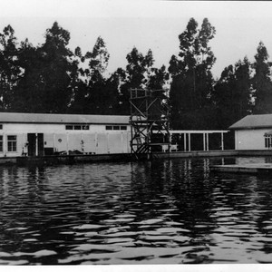 U.S. Army Balloon School at Ross Field in Arcadia, California. Photo of swimming pool which apparently was enlisted men's pool located approximately where Bekins Storage was at 35 W. Huntington Drive. There appear to be two diving platforms. Mr. H.F. Paden, an officer stationed at Ross Field in 1919, says there was another officer's pool of field stone in what is now Arcadia County Park.