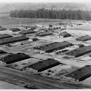 Aerial view, apparently looking northeast, of major portion of Ross Field. Four large barracks-type buildings are along in a row in foreground. There are two other rows of buildings, with flag pole in third row of buildings. Large stand of eucalyptus across background.