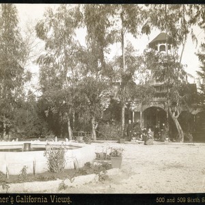Elias J. "Lucky" Baldwin, standing in front of Queen Anne Cottage. There are three unidentified women seated and one standing figure second from right, who appears to be daughter Anita at age eleven. Caption reads Shaffner's California Views.