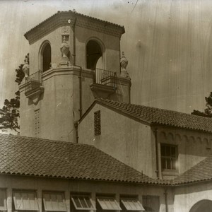 View of Harlan Hall's tower and roof line, Kentfield, California, circa 1930. Harlan Hall was the second facility constructed at the Marin Junior College, and designed by A.A. Cantin, and built by Younger & Horstmeyer in only 65 days. It was completed for a cost of $53,600 in 1929. Originally called the Administration Building, Harlan Hall was renamed in 1938 after George H. Harlan, the first president of the Board of Trustees. The Hall is designed in the Spanish Revival style, also known as Spanish Eclectic, which became popular after the 1915 Panama-California Exposition held in San Diego. The school was known from its beginning in 1926 as Marin Junior College, and renamed College of Marin in 1947. This image is part of the Charles Bach Collection, which features images from the Bach family estate, also located in Kentfield.