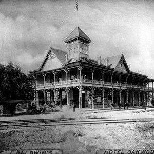 Oakwood Hotel. On right edge of photo, Santa Fe steam engine is coming into view. There are four men seen standing near Hotel. There is a man in a buggy with two horses standing in shade of what appears to be an oak tree. One lady stands on second floor porch.
