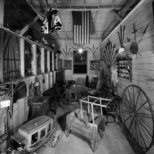 Exhibit room at Pony Express Museum showing swords on three walls, American flag hanging from ceiling, miniature stagecoach marked TAHOE TAVERN, and washing machine marked TERRIFFS PERFECT WASHER, PATD. MAY 7, 1889.