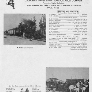 Side 1 lists officers and directors of the William Parker Lyon Pony Express Museum. Side 2 shows drawings of three buildings located on six acres on the old Elias J. "Lucky" Baldwin Santa Anita Rancho located in Arcadia, California. Also shows a map of the museum and vicinity.