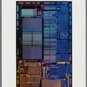 Enlarged color photograph of the Intel486™ microprocessor. The 486s are very similar to their immediate predecessor, the Intel 80386DX. The main differences are that the 486 has an optimised instruction set, has an on-chip unified instruction and data cache, an optional on-chip floating-point unit (FPU), and an enhanced bus interface unit. These improvements yield a rough doubling in performance over an Intel 80386 at the same clock rate.