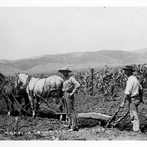2 men and 2 horses plowing through a cornfield in East Whittier, California.