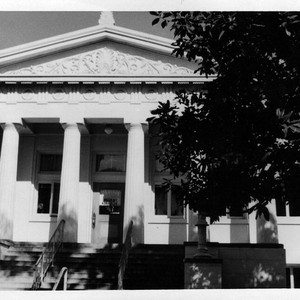 Photograph shows the front door of the Carnegie Library in Whittier. The door to the library is now located at the Whittier Museum.