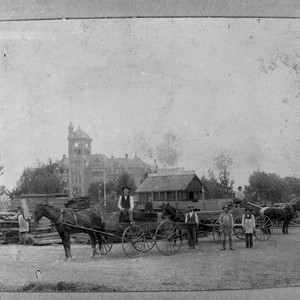 Whittier's second lumber yard in 1888. Wilbert Dorland is sitting in the cart being pulled by "Old Doll," the horse. The State School is in the background.