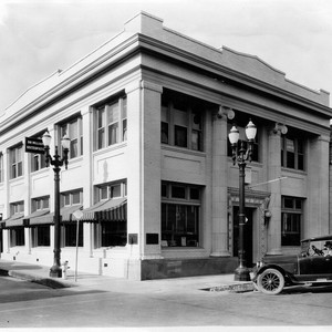 The Whittier Savings Bank located at 206 E. Philadelphia and Bright Avenue on the Northeast corner. Located in the same building is the offices of lawyer, A. Moore, and Osteopath, Dr. Williams. In the right of the photo is a partial view of the Whittier Building and Loan.