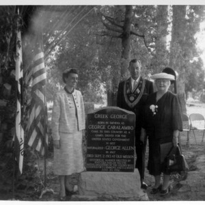 Image depicts memorial gravemarker for the camel driver Greek George. Marker reads: "Greek George, born in Smyrna as George Caralambo came to this country as a camel driver for the United States Government in 1857. Naturalized--George Allen in 1867. Died Spet. 2, 1913 at Old Mission. Historical marker erected by Whittier Parlor No. 298 Native Daughters of the Golden West, Courtesy of F. G. Simmons and R.D. White June 30,1956."