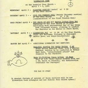Flier of activities during Easter week 1969. These included a Good Friday Way of the Cross procession on Telegraph Avenue; a memorial service for Bobby Hutton conducted by Father Earl Neil, chaplain to the Black Panthers; and a GI-Civilian march in San Francisco on Sunday where, "The Resurrection overcomes the Pentagon."