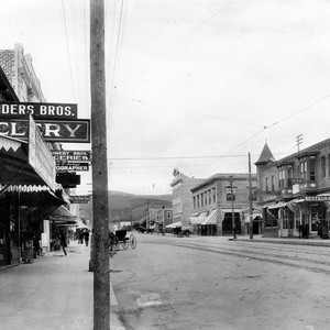 Looking North on Greenleaf Ave. Various business signs can be seen including Saunders Bros Cyclery and the What You Want Store.