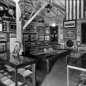 One corner of a room at Pony Express Museum, contains at least five Bird's Eye View Maps. Photo also shows three glass cases with exhibits. Hanging from a 4x4 support post is a glass lamp that reads ROOMS TO LET EL DORADO HOTEL, BODIE.