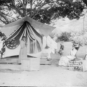 Whittier State School (Fred C. Nelles) Girls encampment at Catalina Island. Wooden crate in photograph says Camp Banning Catalina Island Calif. 2 women and one men are in the photograph. One women is African American.