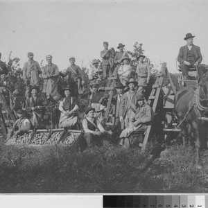 Depicts 19 citrus pickers with crates of fruit in a Whittier citrus fruit grove. All of the men carry bags for holding fruit. A man in suit driving a horse and wagon is in the right of the photograph.