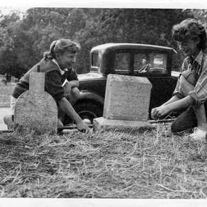 Photograph depicts 2 young women helping to clean the Broadway cemetery (Founder's Park). 2 gravestones are pictured; one is in spanish and the other is for Mary Alice Jones, wife of J.H. Jones.
