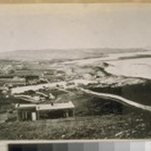 Greenwich and Larkins Sts. In 1857. "Loveland's Cottage" in the foreground. The famous Washwoman's Bay, Strawberry Island, Presidio and Fort Point in the background