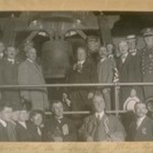 The arrival of the Liberty Bell. Mayor Rolph left and Gov. Johnson on the right of Bell at 12 a.m., 3rd and Townsend St. 1915