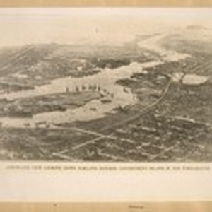Image / Aeroplane view looking down Oakland harbor. Government Island in the foreground. 1919