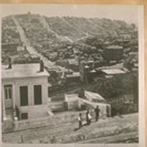S.E. from Hyde & Lombard Sts. about 1870. The white square in this photo is the top of the old brick Greenwich St. School & the large building near it is the old North Cosmopolitan School, Kate Kennedy principal. The building on the side of Telegraph hill is the old Union St. School