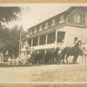 An Old time Hay or Lumber wagon with trailer and 8-horses, in front on the Hotel at Sierra City in 1915 - Sierra Co., Calif