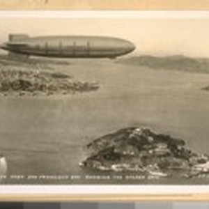 On May 23/32, later destroyed. U.S.S. Akron over San Francisco Bay, showing the Golden Gate. Piggott Photo, S.F
