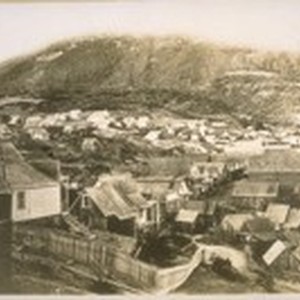 This is Forest City, Sierra Co. Calif. in 1880 one of the Pioneer towns of Calif. Bald Mountain in back ground 1100 ft. higher than Main Street of town, altitude of Bald Mountain is 5660 ft