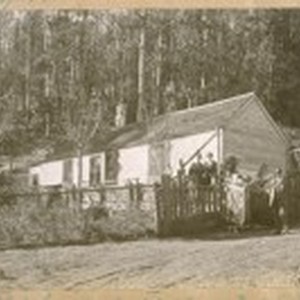 The Old home in the Heart of the Sutro Forest, back of Twin Peaks, built about 1860. Jesse B. Cook at the gate