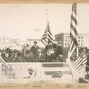 Photo same with Sup. Hooks and his white hat. [Officials in stand at groundbreaking for the new City Hall.]