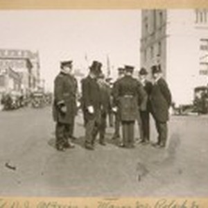 L. to R.: Chief D.J. O'Brien - Mayor Jas. Rolph, Jr. In back of him, Com. Theo. J. Roche - Capt. Wall - In front of him, Capt. Gleeson - Com. Jesse B. Cook, and Com. A.J. Mahoney with his high hat. Oct. 27/23, cor. Polk & McAllister Sts