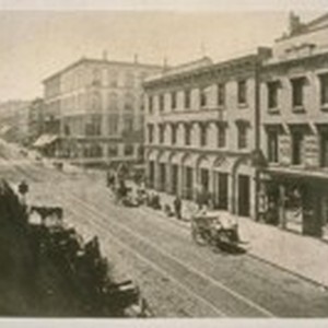 The Old Wells Fargo Express Building N. W. corner Calif. And Montgomery Sts. or looking South on Montgomery on Sacramento St. About 1870