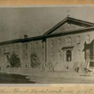 Lincoln School east side of 5th Street between Market and Mission in 1870. In back of School with dark building is the old State Normal School and the building with the clock is the St. Ignatius School in 1870. Turrill and Mill