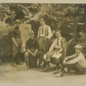 The Sire and his assistants. From left to right. Haig Patigian, Camp Cartoonist; Ed. J. Duffey, Master of Lights; Frank Mathieu, Stage Director; Herman Scheffauer, Sire; Geo. Lyon, Master of Properties. Bohemian Grove. [Photograph by Gabriel Moulin. ]