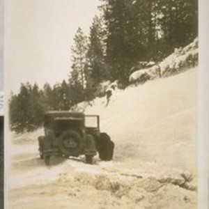 Just 3 miles south of Avery's Calaveras Co., our auto has pulled out of 4 feet of snow and is now on a strip of ice, with Joe A. Murphy breaking the ice, so we can start the auto, as you can see that there is no chance to turn around, so have to go on to Avery's 3 miles ahead. Oh what a snow ride. No more for me. Jany. 24/29