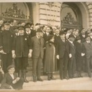 L to R, Front line: Capt. H. Gleeson and Chief of Police D.J. O'Brien - Center: Mr. Jas. Rolph and Mayor Jas. Rolph, Jr. - On the end of line Mrs. and Mr. Rosencrantz, Chairman of the Community Service Circus in front of the City Hall, Polk St. side, March 1922