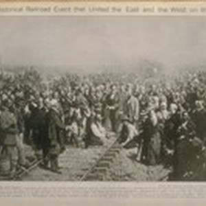 The Historical Railroad Event that United the East and West on this Continent. "Driving the last Spike" connecting the rails of the Central Pacific Company and the Union Pacific Company at Promontory Point, 80 miles west of Ogden and 804 miles east of San Francisco, May 10, 1869