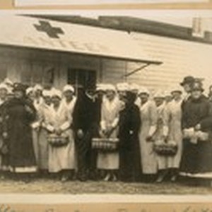 The Oakland Red Cross Workers in front of the Canteen. Mayor Davis in center, Wallace M. Alexander in the front row, second from the Mayor in the dark uniform. World War 1919