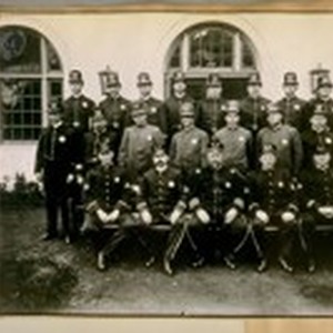 Full titleGolden Gate - Park Station - Top Row: Byrne, Wm. - Mangan, J.J. - Hiett, J. - Deane, E.H. - Murphy, Wm. - Hurley, T. - King James - Dougherty, Peter. Middle Row: McColough, Geo. - Kenny, M. - Hanley, Martin - Moore, Earl - Grigsby, P.F. - Smith T.R. - Williams, Geo. Seated: Corporal F. Mahoney - Sergeant M.J. Griffin - Captain B. McManus - Corporal Ed. Nolan - Corporal Percy Smith.