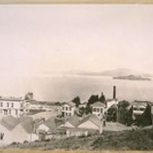 North Beach from Hyde St. above Bay St. in 1885. See smoke stacks of Selby's Smelting and Refining Co.'s