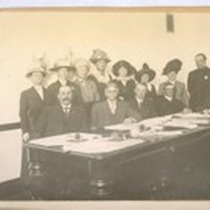 Seated at table L to R: J. Spiro, Jesse B. Cook, Pres. J. Woods, Alex O'Grady, Sect. Chas. Skelly. Chief White standing