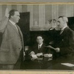 Chief of Police D.A. White taking his oath of office, 1911. L to R: D.A. White, Sect. Chas. F. Skelly and Max Goldberg, Pres. of the Board of Police Com