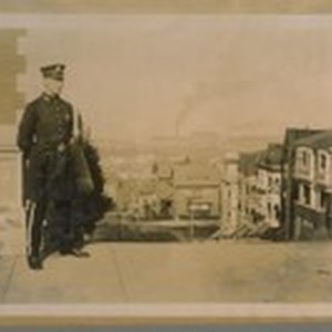 North on Buchannan [Buchanan] St. from Fillmore St. Hill, 1919. Wm. Hart the actor in the uniform of a S.F. [San Francisco] Police Officer