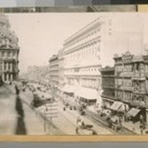 Looking East on Market from Powell, see the Baldwin Hotel on the left and the Emporium, Academy of Sciense [sic] and James Flood Blds. on the right