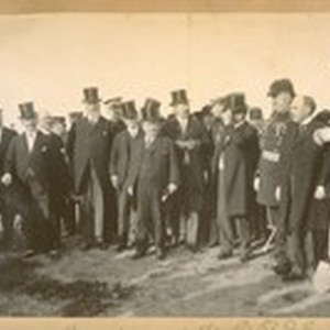 Ground Breaking of the P.P.I. [Panama-Pacific International] Exposition 1912. L to R in high hats: [?], De Young-Foster, [?], M.J. [Brandenstine?] Scott-C.C. Moore, Gen. Mayor Rolph, Mr. Crothers of the S.F. [San Francisco] Bulletin