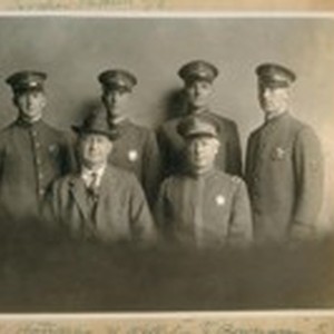 L. to R.: Standing H. Kellehir, F. Bowerman, E.J. Dutil, A.T. Hanson. Sitting: F. Lotsey and Lieut. J.C. Field, March 1924. S.F.P. [San Francisco Police] Depot