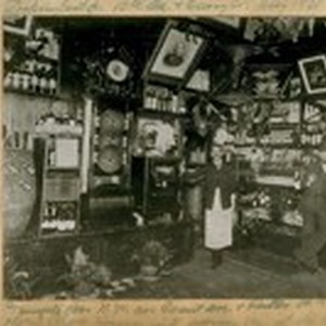 Temple Bar N.W. cor. Grant Ave. & Sutter St. Proprietor's son, Chas. Harris with apron on at the Bar, 1895