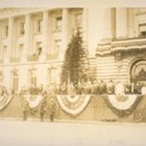 Nov. 3/28. [The annual inspection of the San Francisco] Police Dept. with Mayor Jas. Rolph Jr., Theo. J. Roche, Jesse B. Cook, Andrew F. Mahony and Thos. Walsh, Det. Sergt. Capt. Fred Lemon and Chief W. J. O'Brien in front of the Grand Stand