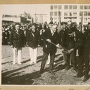 Nov. 11/26. Breaking ground for the American Legin [Legion] Bldg. L. to R. (Center): Wm. H. Crocker, Chas. H. Kendrick, and Eugene D. Bennett